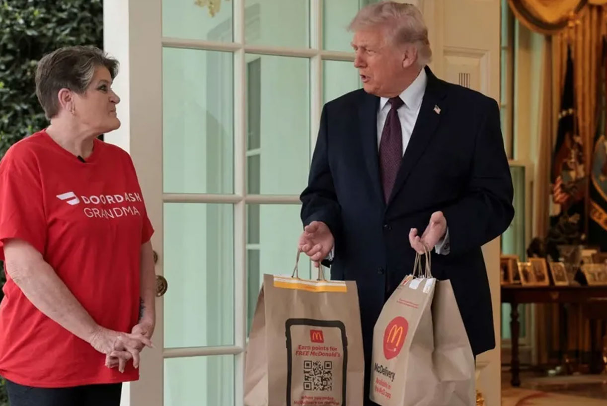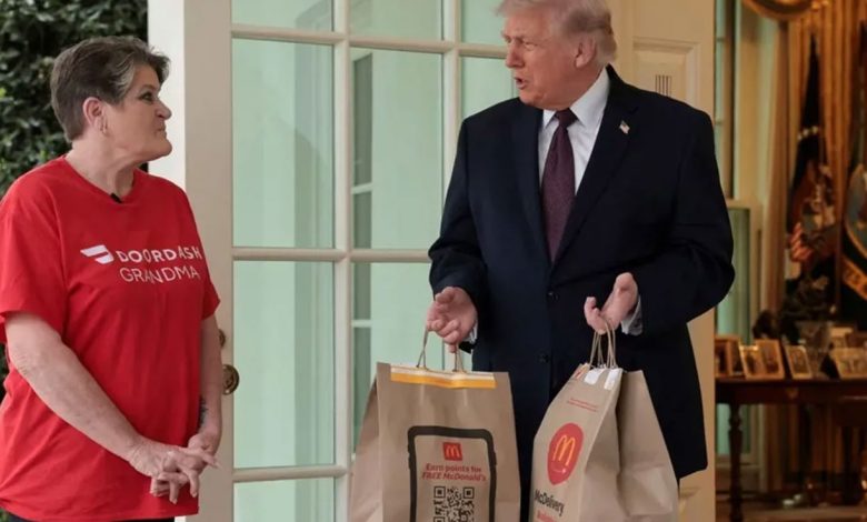 في مشهد لافت، فاجأ الرئيس الأميركي دونالد ترامب الصحافيين باستدعائهم إلى الجناح الغربي، قبل أن يفتح الباب لاستقبال امرأة ترتدي قميصاً يحمل عبارة “DoorDash Grandma”، حاملةً كيسين كبيرين من طعام "ماكدونالدز".