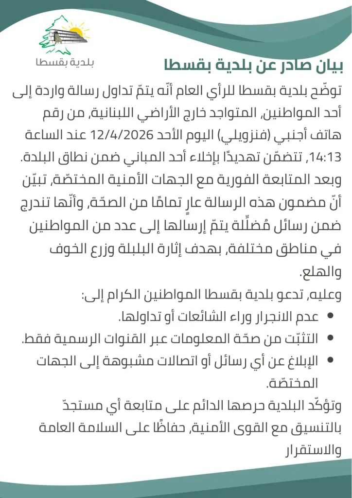 أوضحت بلدية بقسطا - قضاء صيدا، في بيان، أنّه "يتمّ تداول رسالة واردة إلى أحد المواطنين، الموجودين خارج الأراضي اللبنانية، من رقم هاتف أجنبي (فنزويلي) اليوم الأحد 12/4/2026 عند الساعة 14:13، تتضمّن تهديدًا بإخلاء أحد المباني ضمن نطاق البلدة.