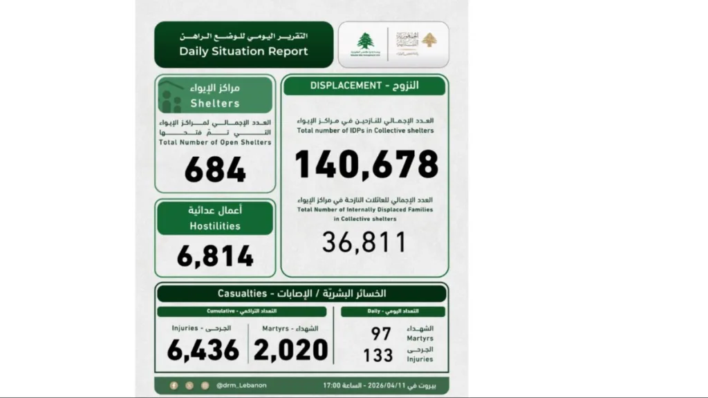 صدر التقرير اليومي للوضع الراهن عن "وحدة إدارة مخاطر الكوارث" في السراي الكبير ليوم 11 نيسان 2026.