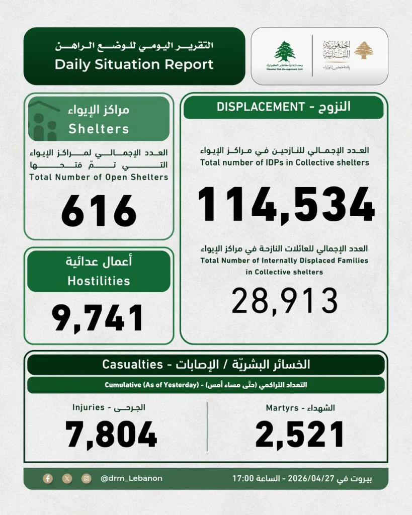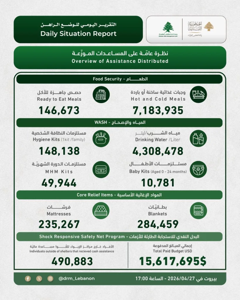 صدر التقرير اليومي للوضع الراهن عن "وحدة إدارة مخاطر الكوارث" في السراي الكبير.