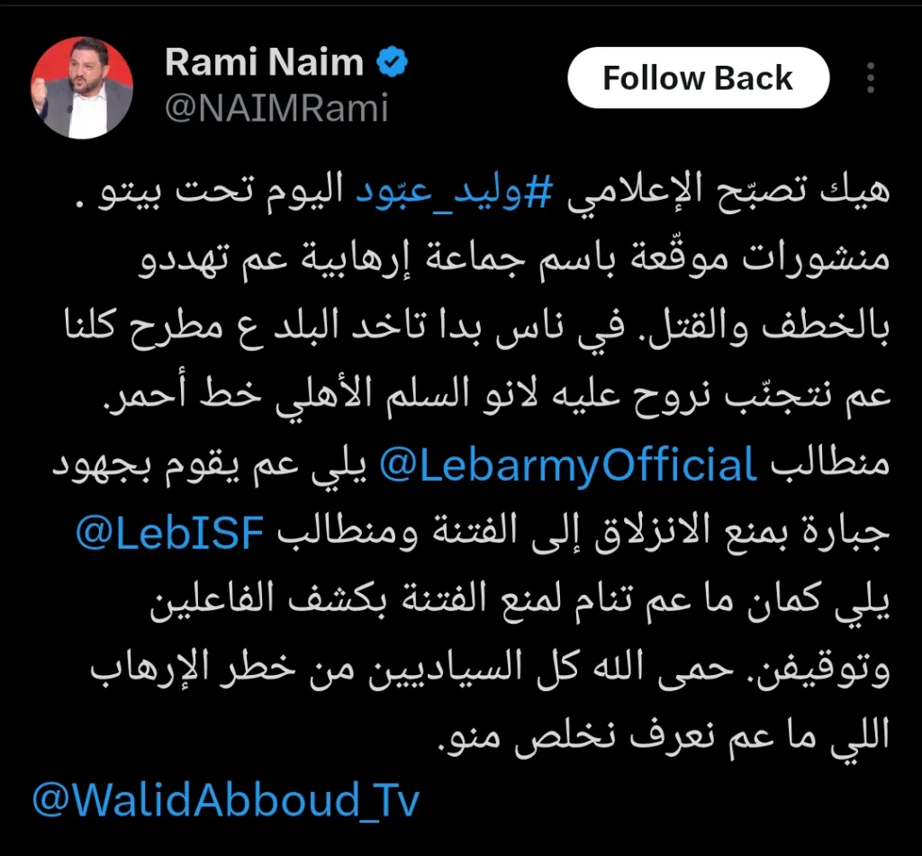 كتب الصحافي رامي نعيم عبر صفحته على منصة “إكس” أن الإعلامي وليد عبود تعرّض صباح اليوم لتهديدات مباشرة أمام منزله، من خلال منشورات موقعة باسم جماعة إرهابية، تضمنت تهديدات بالخطف والقتل.