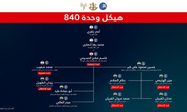 وأكد البيان أن الوحدة 840 تتحمل مسؤولية تطوير وتوجيه “العمليات ضد إسرائيليين ويهود داخل البلاد وخارجها”، لافتًا إلى أن هذه العمليات المعلنة تضاف إلى “إجراءات أخرى اتخذت خلال الحرب”، بينها إحباط محاولات تهريب أسلحة إيرانية متطورة إلى الضفة الغربية، واستهداف معسكرات للجيش السوري شرقي البلاد كانت تُستخدم من قبل الوحدة.
