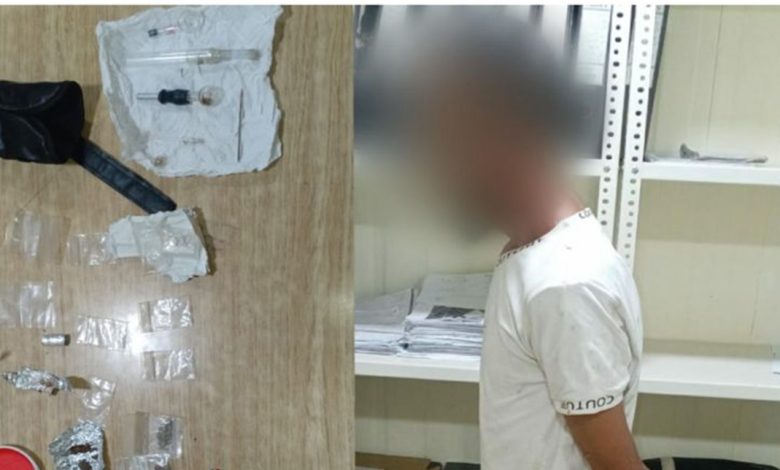 بتفتيشه، عُثر بحوزته على موادّ مخدّرة مختلفة الأنواع (الكريستال، السيلفيا، حشيشة الكيف، حبوب مخدّرة…) مقسّمة داخل أكياس من النايلون صغيرة الحجم، ومعدّة للتّرويج.