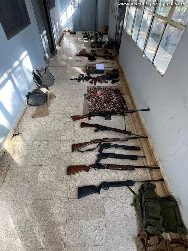 صدر عن قيادة الجيش – مديرية التوجيه البيان الآتي: “بتاريخ 21 / 9 / 2025 وبعد توافر معلومات حول عصابة تعمل بالاتجار بالأسلحة، دهمت وحدة من الجيش تؤازرها دورية من مديرية المخابرات في منطقة مجدل عنجر – زحلة منازل المواطنين: (ا.ع.)، (ن.ج.)، (م.ي.)، (ر.خ.) وأوقفتهم، وصادرت كمية كبيرة من الأسلحة الخفيفة والمتوسطة والذخائر الحربية بالإضافة إلى أعتدة عسكرية. سُلّمت المضبوطات وبوشر التحقيق مع الموقوفين بإشراف القضاء المختص”.