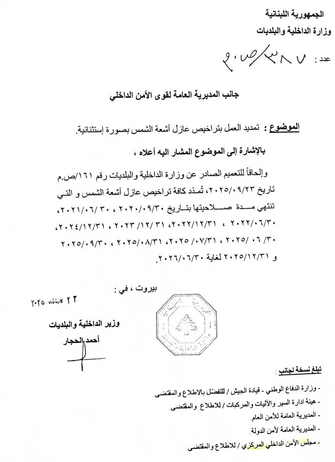 مدّدت وزارة الداخلية والبلديات العمل بتراخيص عازل أشعة الشمس، بصورة إستثنائية لغاية 30/6/2026