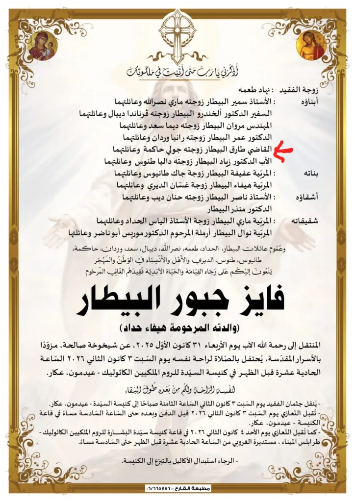 ويُحتفل بالصلاة لراحة نفسه يوم السبت في 3 كانون الثاني 2026، عند الساعة 11:00 قبل الظهر، في كنيسة السيدة للروم الملكيين الكاثوليك في بلدة عيدمون – عكار، على أن يُنقل جثمانه بعدها إلى مثواه الأخير.
