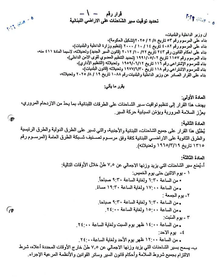 عمّمت وزارة الداخلية والبلديات القرار رقم 1 تاريخ 2026/1/5، بشأن تنظيم إجراءات وتوقيت سير الشاحنات على الأراضي اللبنانية كافة.