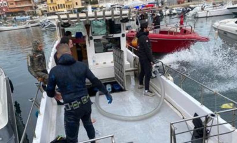 عمل الدفاع المدني ووحدة الانقاذ البحري، على سحب مركب سياحيّ بعد غرقه بالكامل في ميناء صور، صباح اليوم.