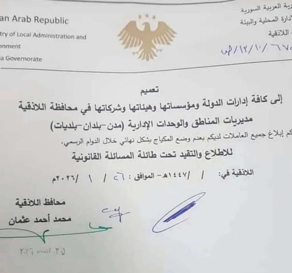 أصدر محافظ اللاذقية تعميماً إدارياً موجّهاً إلى مؤسسات الدولة الانتقالية في محافظة اللاذقية، يتضمّن منع وضع المكياج بشكل نهائي خلال الدوام الرسمي.