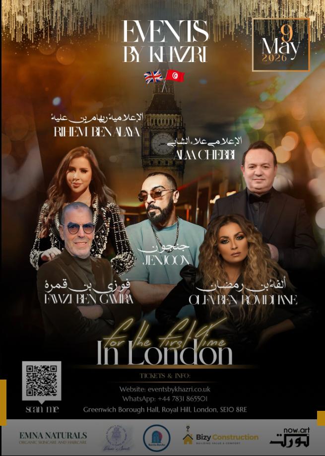 في قلب لندن، وعلى وقع الحنين إلى الوطن ونبض الموسيقى التونسية، تستعد الجالية التونسية وعشاق الفن العربي لعيش واحدة من أبرز السهرات الفنية المنتظرة خلال سنة 2026، وذلك من خلال تظاهرة “تونس في لندن” التي تعد بأن تكون ليلة استثنائية بكل المقاييس، تجمع بين تنوّع الأنماط الموسيقية وروح الفرح التونسي الأصيل في فضاء عالمي مفتوح على الثقافات.