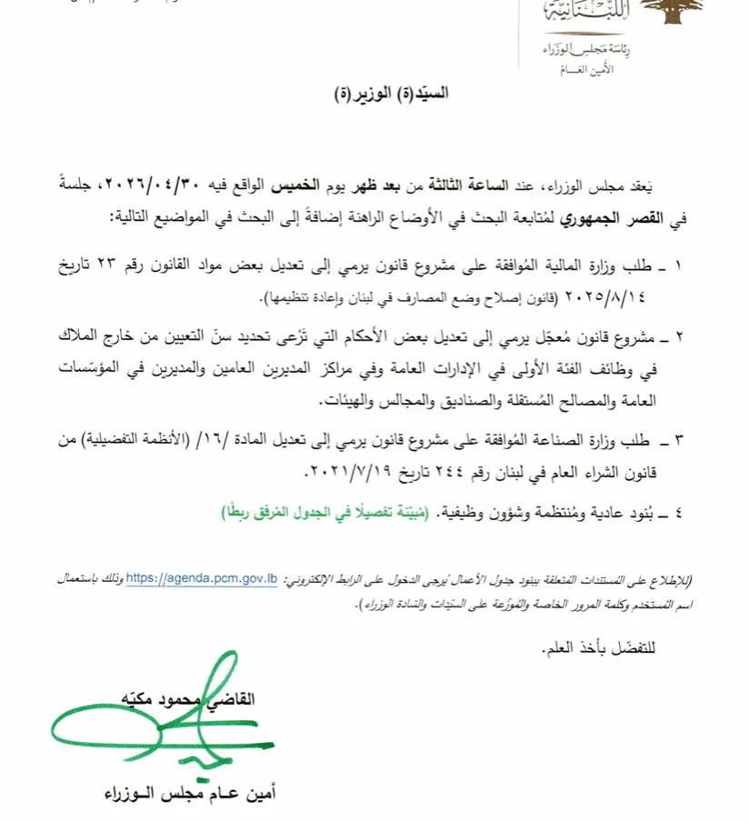 يعقد مجلس الوزراء جلسة نهار الخميس المقبل في القصر الجمهوري، الساعة الثالثة بعد الظهر.